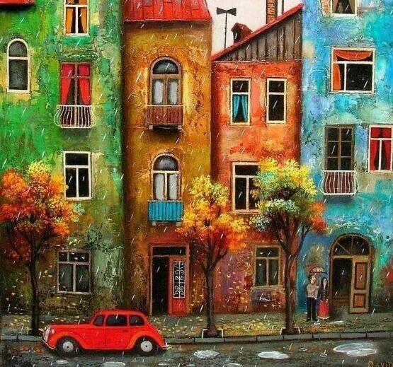 This painting bursts with color and life, capturing a lively street lined with vibrant buildings in shades of green, yellow, orange, and blue. Each wall tells its own story, brought to life by rich textures and expressive brushstrokes. The red car and autumn trees add warmth and motion, creating a playful yet nostalgic city scene. It’s a joyful piece that brightens any room and reminds you of the beauty in everyday moments.